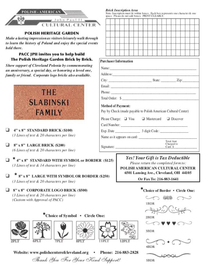 This is a great opportunity to create a lasting memory for a loved one or your family to be recognized as supporters of the Polish-American Community in Cleveland, OH. For businesses and other organizations, it is a great way to demonstrate support of Polish-American heritage within the Cleveland area.